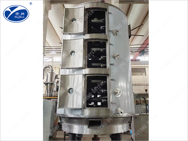 The wet material self-feeder is continuously added to the first layer disc of the drying equipment, and the rake arm with the rake blade makes a rotating motion, so that the rake blade continuously turns over the material, and the material flows through the surface of the drying disc along the exponential helix, and the material on the low drying disc moves to the outer edge, and falls to the outer edge of the high drying disc below. The material on the high drying tray moves inward and falls from the middle to the next layer of low drying tray, and the high and low drying tray is arranged alternately up and down, so that the material can continuously flow through the entire drying equipment. The heating medium is fed into the hollow drying tray, and the heating medium enters from one end to the other end, and the dried material falls from the last layer of drying tray to the bottom of the shell. Finally, it is moved to the feed port by the rake blade. The steam evaporates out through the wet outlet set on the top, and the solvent is recovered by the condenser and then discharged out through the vacuum pump. The dry material flowing from the bottom is cooled and packaged directly.