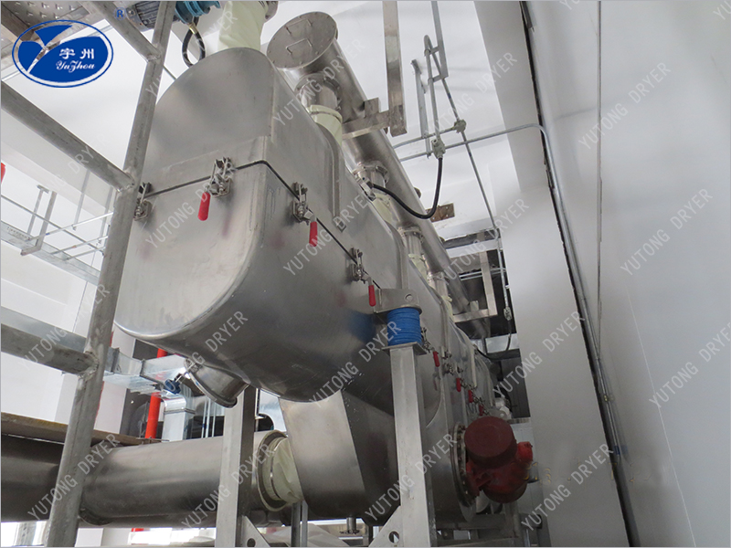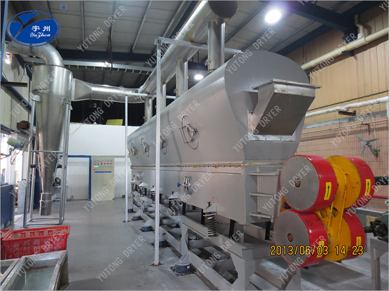 ③ Due to the application of vibration, the minimum fluidizing gas speed can be reduced, so the air demand can be significantly reduced, and then the dust layer entailing can be reduced, the matching heat source, fan, cyclone separator, etc., can also be reduced accordingly, the complete set of equipment is reduced, and the energy saving effect is obvious. The in-machine residence time can be easily changed by adjusting vibration parameters. The operation of the piston flow reduces the requirements of material particle size uniformity and regularity, and it is easy to obtain uniform dry products.