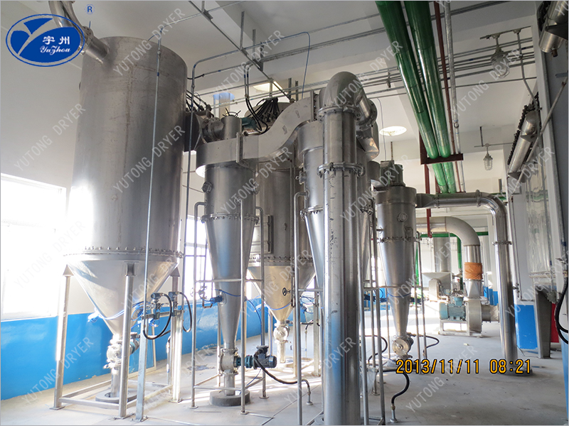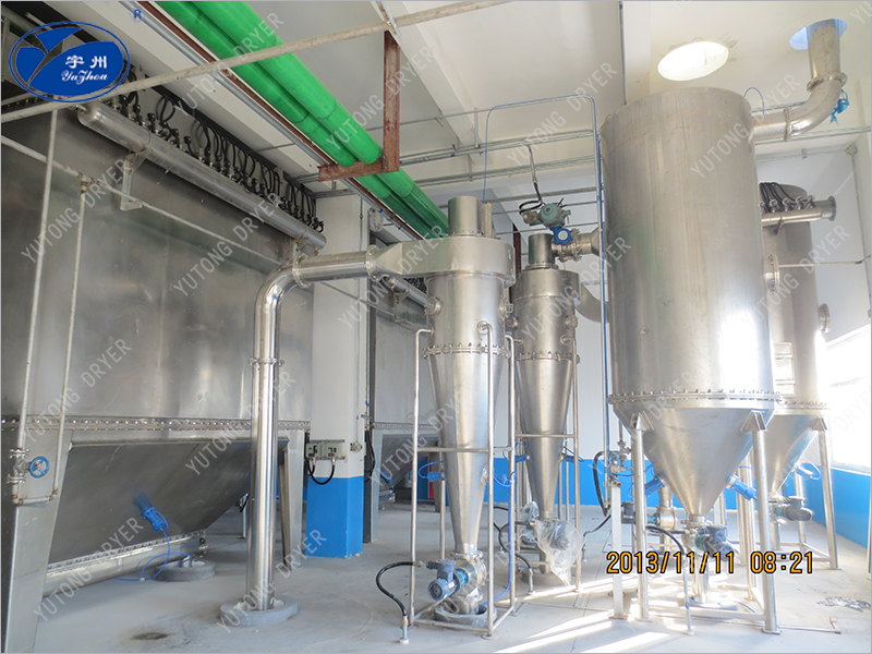 經(jīng)過初、中效過濾的環(huán)境空氣由干燥系統(tǒng)引風機吸入熱風空氣,與蒸汽換熱后產(chǎn)生的熱風進入閃蒸干燥主機,與經(jīng)過螺旋加料器送入干燥主機的待干燥濾餅,在干燥主機內(nèi)完成傳熱傳質(zhì)的干燥過程,氣固混合物由旋風分離器和布袋除塵器分離,物料被從干燥系統(tǒng)氣體內(nèi)分離出來,排出干燥系統(tǒng),尾氣由引風機排入大氣。