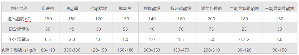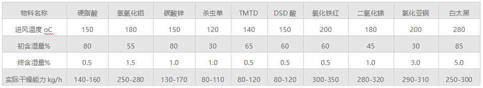 注:1、水份蒸發量以進風溫度200℃出風80℃計算;2、裝機容量為基本數據,可根據物料的理化性能改變;3、占地面積根據實際情況布置,表中數據僅供參考。